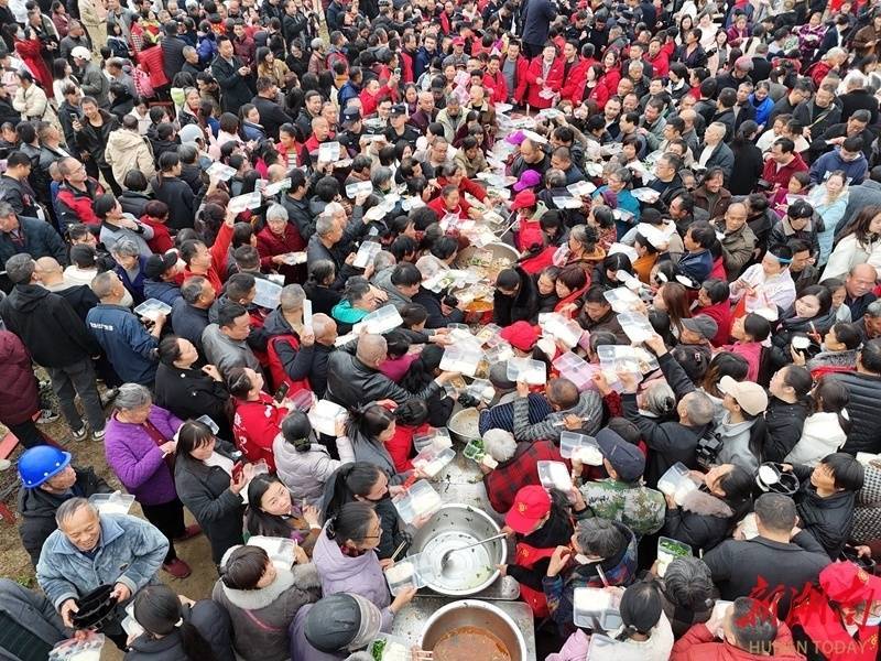 1月16日,双峰县洪山殿镇金桥村,游客排队品尝杀猪饭。当天,金桥村贤才果蔬基地举办杀年猪体验活动。游客们参与捉鸡、摸鱼等农趣体验,共享杀猪饭,感受浓浓乡村年味。李建新 谢姣如 摄影报道(湖南图片库)