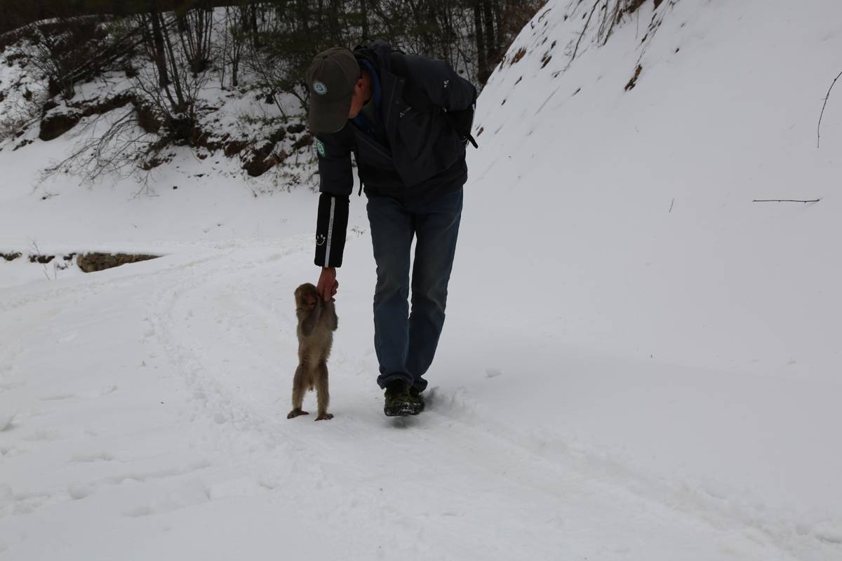 二月隆冬,天未亮透,海拔2300多米的神农架温水林场百草园护林站,静得只剩风声。护林站站长谭明宽刚从被窝坐起,门缝里便探进一个小脑袋——是不到两岁的小猕猴“猴健”。