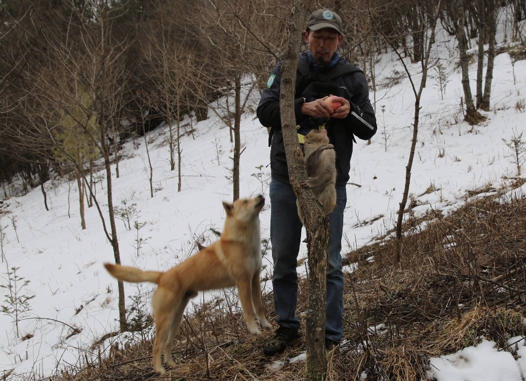 护林站站长谭明宽为小猴和小狗分苹果。