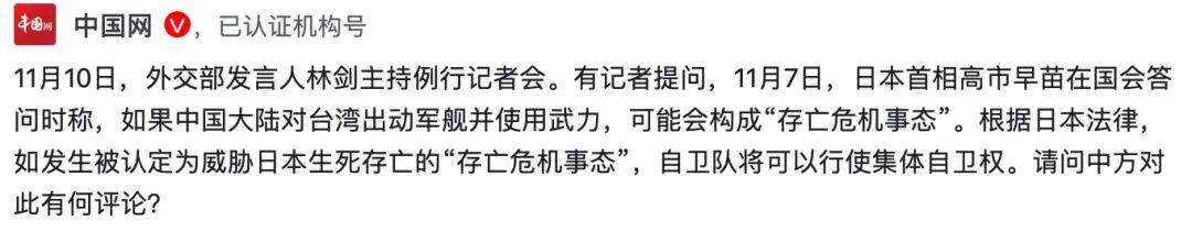 所以大家一定要搞清楚,高市早苗所谓的“台海有事就是日本有事”,归根结底是拿去哄她的选民的,高潮自然可以一波接一波,但跟现实世界狗屁关系都没有。