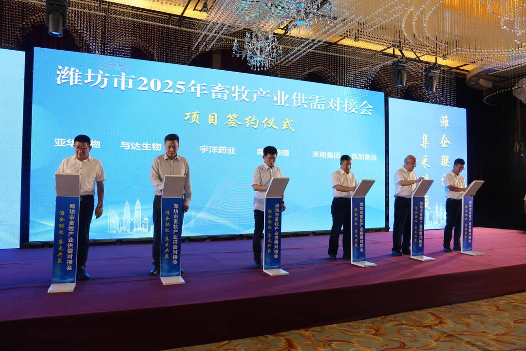 9月16日至17日,“潍企联牧.集采共赢”——潍坊市2025年畜牧产业供需对接会在潍坊高密举办。活动以“政企链动促供需产业协同创共赢”为主题,通过产品展示、成果发布、专题授课等形式,搭建起资源共享、市场共建、产业链上下游协同的高效平台。省、市、县畜牧兽医部门、行业专家学者及近600家企业代表参加,30余家饲料、兽药、养殖重点企业现场签订合作订单,成交额达1.52亿元。